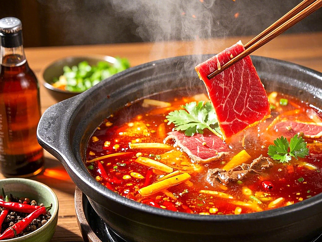 -hot pot Broth: Choose between spicy, mushroom, tomato, or herbal bases. In Sichuan-style hot pot, a split pot (鸳鸯锅) offers both spicy and mild broths.